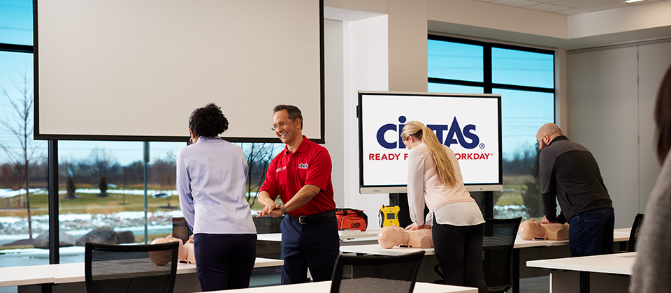 Cintas offers online First Aid, CPR and AED courses combined with instructor-led training.